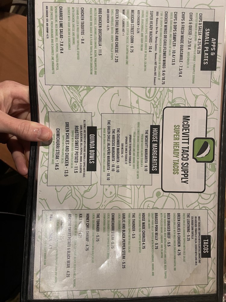 Welcome to McDevitt Taco Supply, where tacos transform into culinary masterpieces! Located in Boulder, CO, this vibrant eatery offers an exciting menu designed to tantalize your taste buds. Start with delightful appetizers like the Chips and Guacamole or BBQ Chicken Quesadilla. Then dive into their signature tacos, including the rich Chocopotle Beef Taco, highlighting notes of chocolate and cinnamon, or the refreshing Taco al Pastor with succulent pork and pineapple. The street corn bowl is a crowd favorite, while the friendly staff makes for an inviting atmosphere. For a unique twist, don’t miss seasonal specials like the Pork Belly Taco, celebrated for its savory depth. Whether you’re grabbing a quick bite or savoring a leisurely meal, McDevitt Taco Supply delivers an unforgettable flavor experience!
